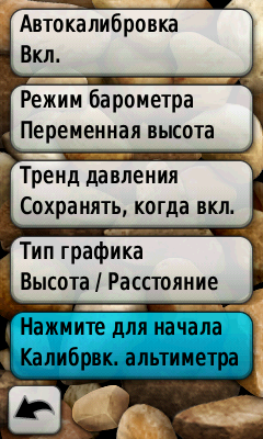 В главном меню выберите функцию «Настройки», затем перейдите в раздел «Альтиметр», в приведенном списке выберите «Калибровка альтиметра»