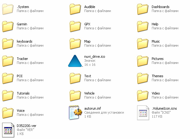 Содержимое корневой папки внутренней памяти автомобильных навигаторов nuvi 1xxx и новее: