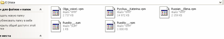 В папке содержаться файлы с расширением vpm это пакеты голосовых подсказок. Как правило, в названии файла указан язык голосового пакета. Файлы с поддержкой TTS (произносит название улиц) можно отличить по значительно большему объему (сравните файл Pycckuu_Katerina.vpm и Russian__Elena.vpm на скриншоте вверху).