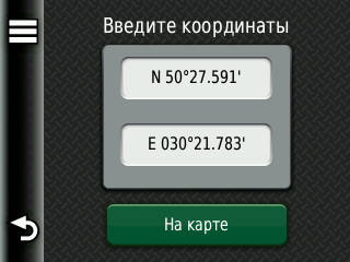 Nuvi 2250 поддерживает ввод места назначения не только по адресам и названиям объекта, но и по координатам широта/долгота. Такая возможность может пригодиться для тех мест, где не существует обычного адресного поиска, или же просто нет крупных дорог.