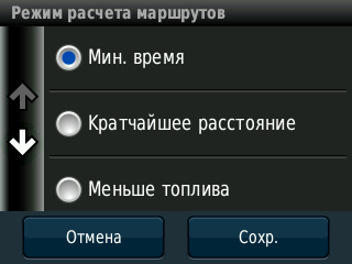 Чтобы выбрать режим экономии топлива перейдите из Главного Меню – Инструменты - Настройки – Навигация – Автомобиль – ecoRoute – Метод прокладки маршрута – Экономия топлива. Когда этот режим выбран nuvi 2250 постарается определить экономичный маршрут на основе информации о скоростном режиме дорог и возможности ускорения, если такой маршрут не будет найден, то проложенный маршрут будет рассчитан по настройкам «Минимальное время».